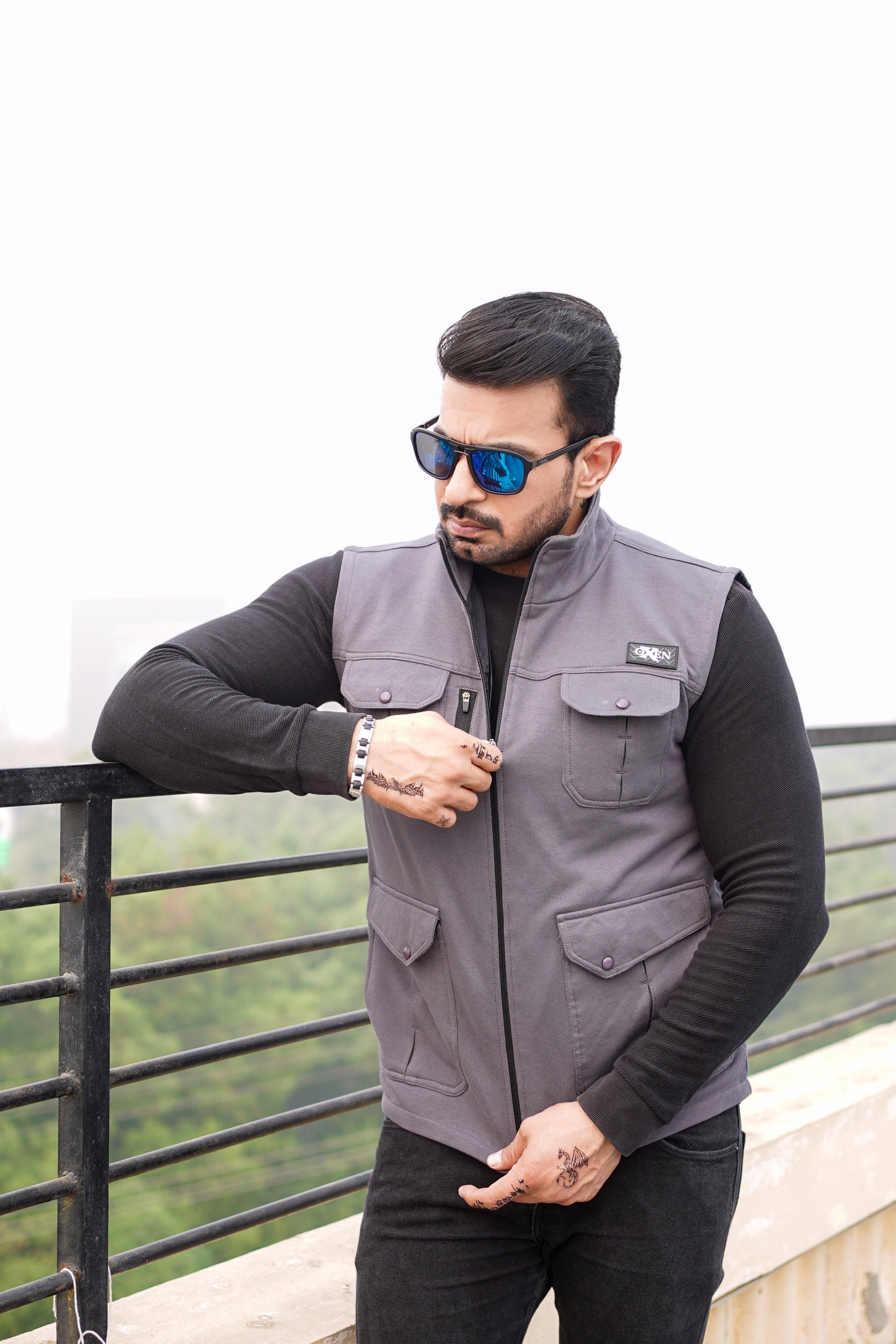 Premium Cotton Fleece Four Pocket sleeveless Jacket Grey  Jkt-02