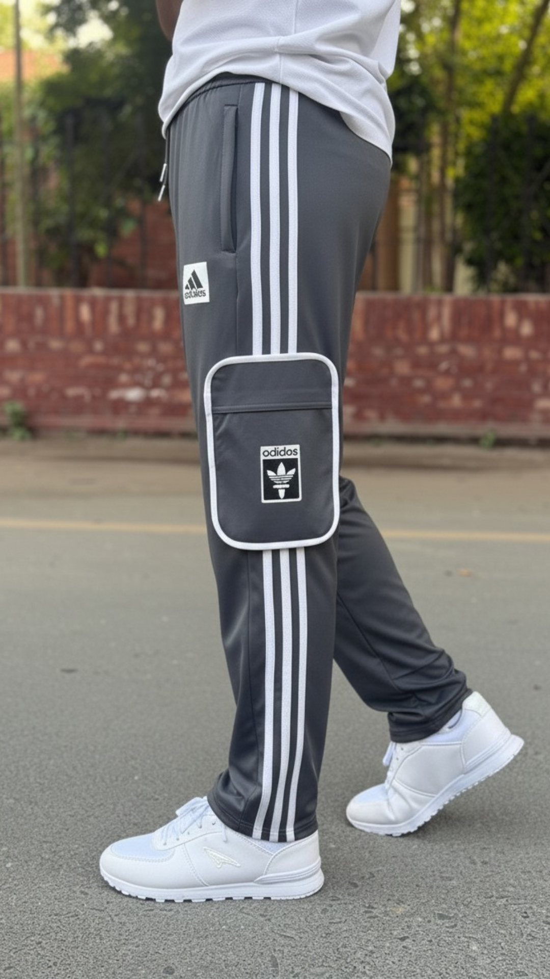 Premium Gray Three Tapes Men's 4 way Stretch-able Lycra Oval Pocket Cargo Trousers